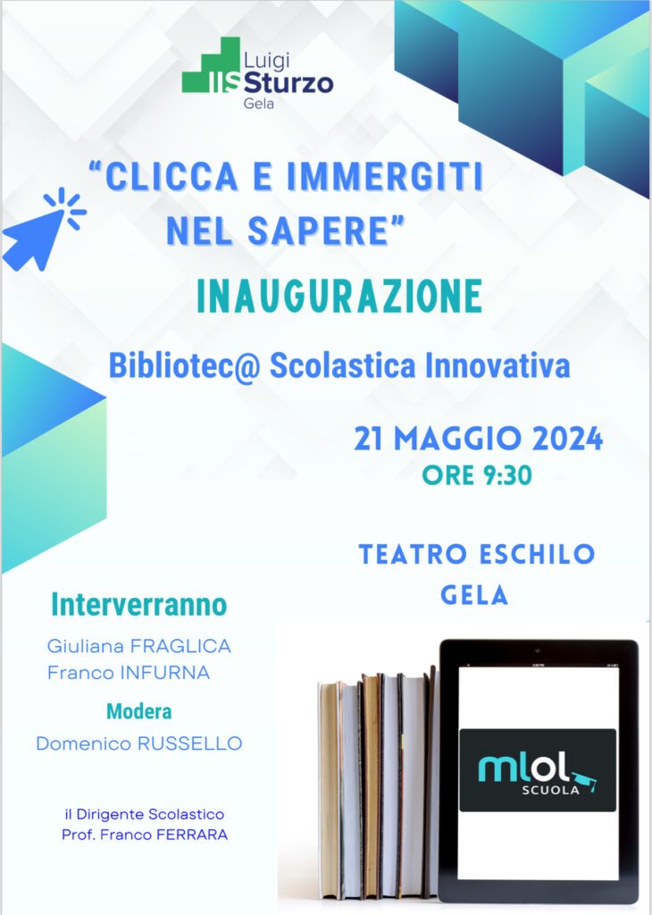 L’istituto “Luigi Sturzo” inaugura la nuova Bibliotec@ Scolastica Innovativa: l’evento, dal titolo “Clicca e immergiti nel sapere”, è in programma martedì prossimo, 21 maggio, dalle 9.30 al teatro Eschilo. A darne comunicazione il dirigente scolastico, prof. Franco Ferrara, e l’intera comunità studentesca dello “Sturzo”.