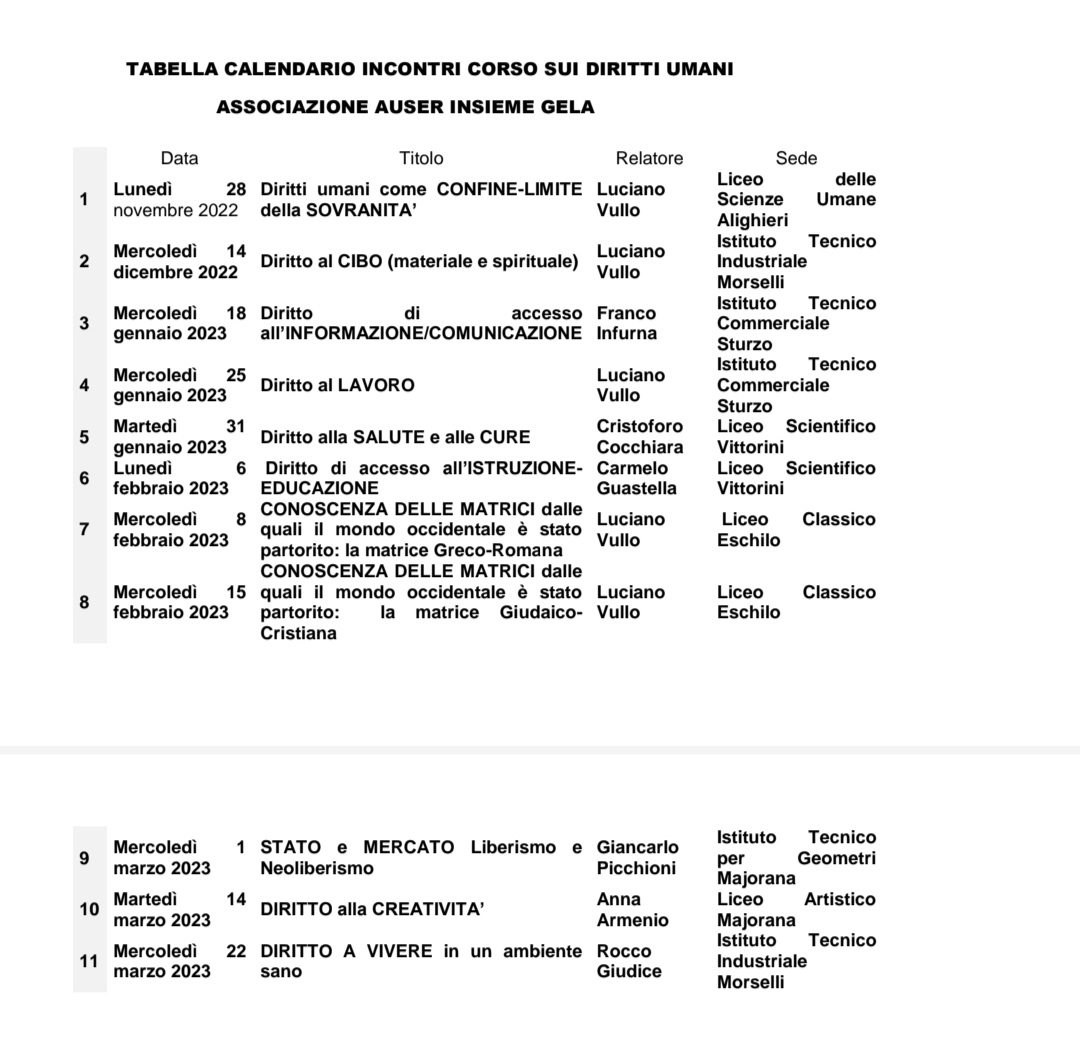 Con la relazione dal titolo "diritti umani come confine/limite sulla sovranità", illustrata dal preside emerito, prof. Luciano Vullo, agli studenti di quinta classe dell'ex istituto magistrale "Dante Alighieri" di Gela, il circolo gelese "Auser Insieme" ha dato il via al corso sui “Diritti Umani nell’Era della Globalizzazione” che prevede 11 incontri con tutte le scuole superiori della città. "Vogliamo realizzare con i giovani uno scambio intergenerazionale di esperienze e suscitare in loro il desiderio ad essere protagonisti per riscattare questo nostro territorio dalla profonda crisi culturale, sociale ed economica"- ha detto il presidente Auser, Emanuele Scicolone, spiegando lo scopo dell'iniziativa all'assemblea composta dai ragazzi e da una delegazione della stessa associazione. L'ex preside Vullo ha quindi tenuto magistralmente la sua relazione coinvolgendo l'uditorio studentesco che ha poi sollecitato il relatore con domande interessanti e appropriate, aprendo quel dialogo auspicato da Auser. Il preside, Maurizio Tedesco, ha molto apprezzato l'iniziativa e ha ringraziato relatore e studenti, dando appuntamento all'Auser con altri incontri previsti nel mese di febbraio presso il liceo classico "Eschilo", dove il preside Vullo affrontera’ il tema la Matrice Greco-Romana e la matrice Giudaico-Cristiana del mondo occidentale. Il programma sui diritti umani dell'Auser si concluderà a metà marzo e affronterà, anche con altri relatori qualificati, i problemi legati alla tutela del diritto al cibo, all'informazione, al lavoro, alla salute, all'istruzione, al libero mercato, alla creatività, alla vita.