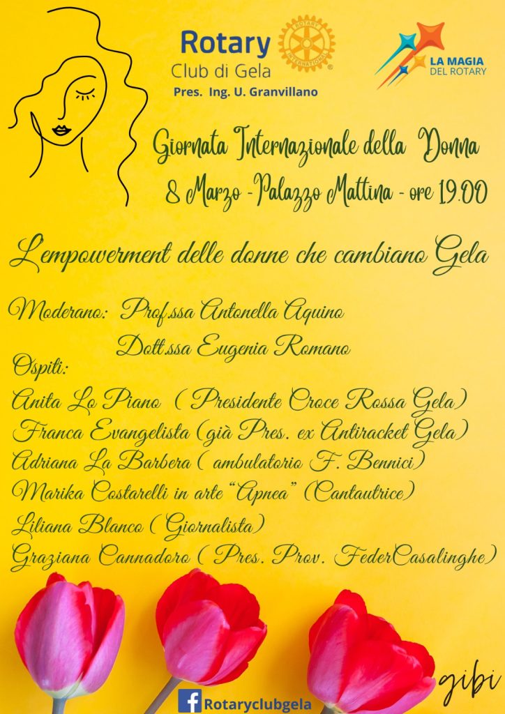 La giornata internazionale della donna per il Rotary si celebra parlando dell’Empowerment delle Donne che cambiano Gela.L' 8 marzo, al Palazzo Mattina, ore 19:00 si terrà un incontro sulle Donne geles...