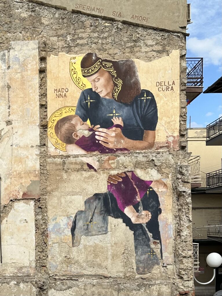 Il dipinto è stato realizzato nella città di Gela, che negli ultimi anni ha affrontato una complessa transizione dopo la chiusura della raffineria. Un evento che ha avuto un impatto significativo sulla comunità, sia in termini di occupazione che di salute ambientale. Il dipinto di Igor Scalisi Palminteri riflette l'importanza di affrontare e risolvere le sfide ambientali che Gela e altre comunità possono incontrare. La Madonna della Cura ritrae infatti una madre amorevole che si prende cura di un bambino, immagine tenera e potente al tempo stesso, richiamo diretto all'importanza di prendersi cura del territorio in cui viviamo: un messaggio universale di responsabilità collettiva.