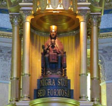 La Madonna, rappresentata seduta mentre regge in grembo il Figlio divino, che tiene la destra sollevata come a benedire, porta sul capo una specie di turbante, anch’esso in legno di cedro, decorato con leggeri arabeschi dorati. Si narra che la statua, approdata nella baia a causa di una violenta tempesta notturna, ai tempi dell’iconoclastia tra l’VIII e il IX secolo, nascosta nella stiva di una nave proveniente da oriente, elesse la spiaggia di Marinello a sua dimora. La mattina seguente avvenne qualcosa di inspiegabile e cioè che la nave, nonostante i numerosi tentativi dei marinai di disincagliarla da quel tratto di mare, non riuscisse a muoversi, come se una forza misteriosa glielo impedisse; la stessa forza che, lasciata la Madonna sulla spiaggia, la aiutò vigorosamente a riprendere il largo. Sulla Vergine Nera, trovata in questa piccola rada da alcuni pescatori, fiorirono da allora tantissime leggende che richiamarono un numero sempre maggiore di devoti.