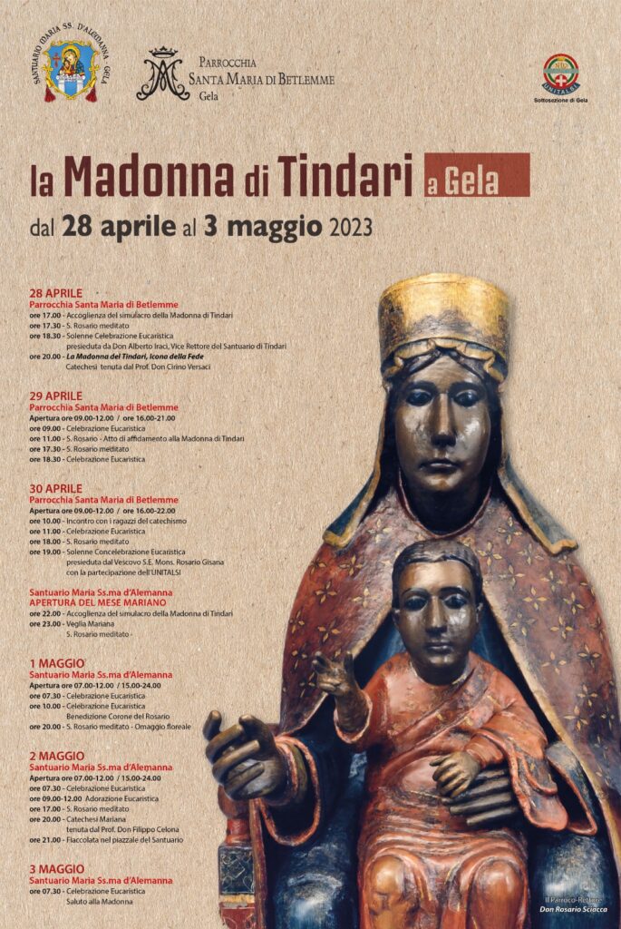 In occasione della visita della Madonna di Tindari a Gela dal 28 aprile al 3 maggio, Don Rosario Sciacca, parroco della chiesa di Santa Maria di Betlemme e rettore del santuario di Maria Santissima d'Alemanna di Gela ha reso noto il programma degli eventi liturgici.