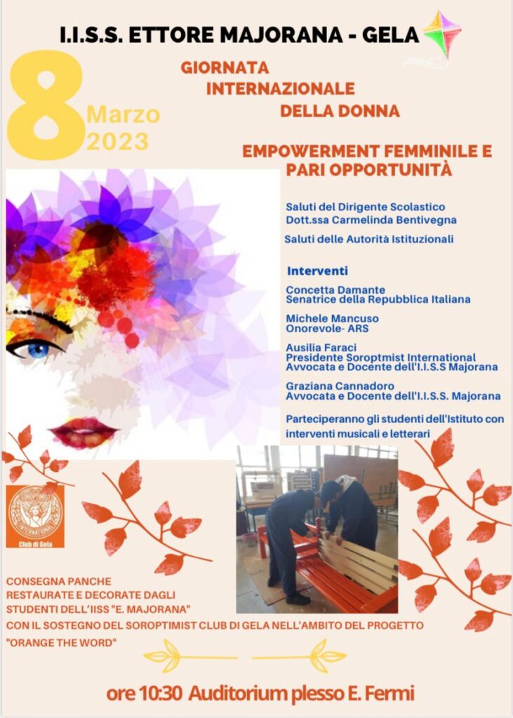 In occasione della Giornata Internazionale della Donna, presso l'Istituto scolastico Majorana, il Soroptimist Club di Gela ha parlato di empowerment femminile e dell'importanza di accelerare il processo di pari opportunità attraverso strumenti normativi e misure di intervento idonei a riequilibrare le condizioni di svantaggio che le donne ancora incontrano nella società.