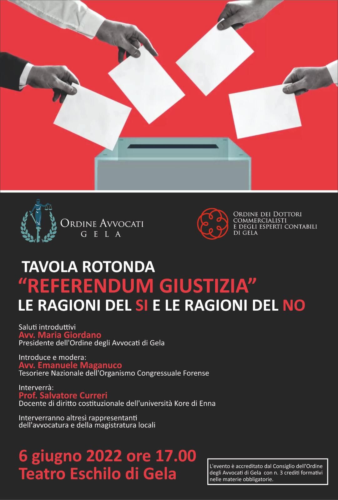 L'Ordine degli avvocati e dei dottori commercialisti ha organizzato una tavola rotonda per rendere edotti i cittadini sulle ragioni del si e del no dei Referendum sui temi della giustizia. Dopo i saluti del presidente dell'Ordine degli avvocati di Gela Maria Giordano, i temi saranno introdotti da Emanuele Maganuco e verranno sviscerati dal docente di diritto costituzionale dell'Università di Enna Salvatore Curreri oggi alle 17 al Teatro Eschilo di Gela.