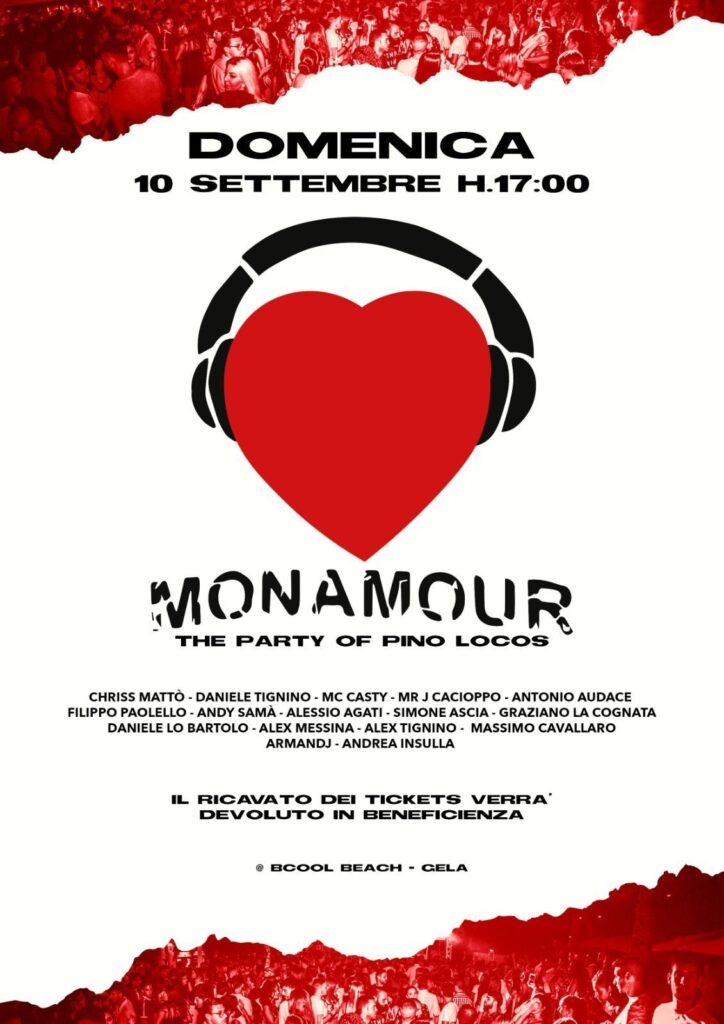 Si terrà domenica 10 settembre dalle 17.30 al BCool beach l’evento “Monamour”, supportato dai più rinomati DJ e Vocalist della nightlife locale, che animerà una delle ultime serate dell’estate 2023 in onore del vocalist Giuseppe Lo Chiano, in arte conosciuto come "Pino Locos", scomparso prematuramente il 18 Agosto scorso.