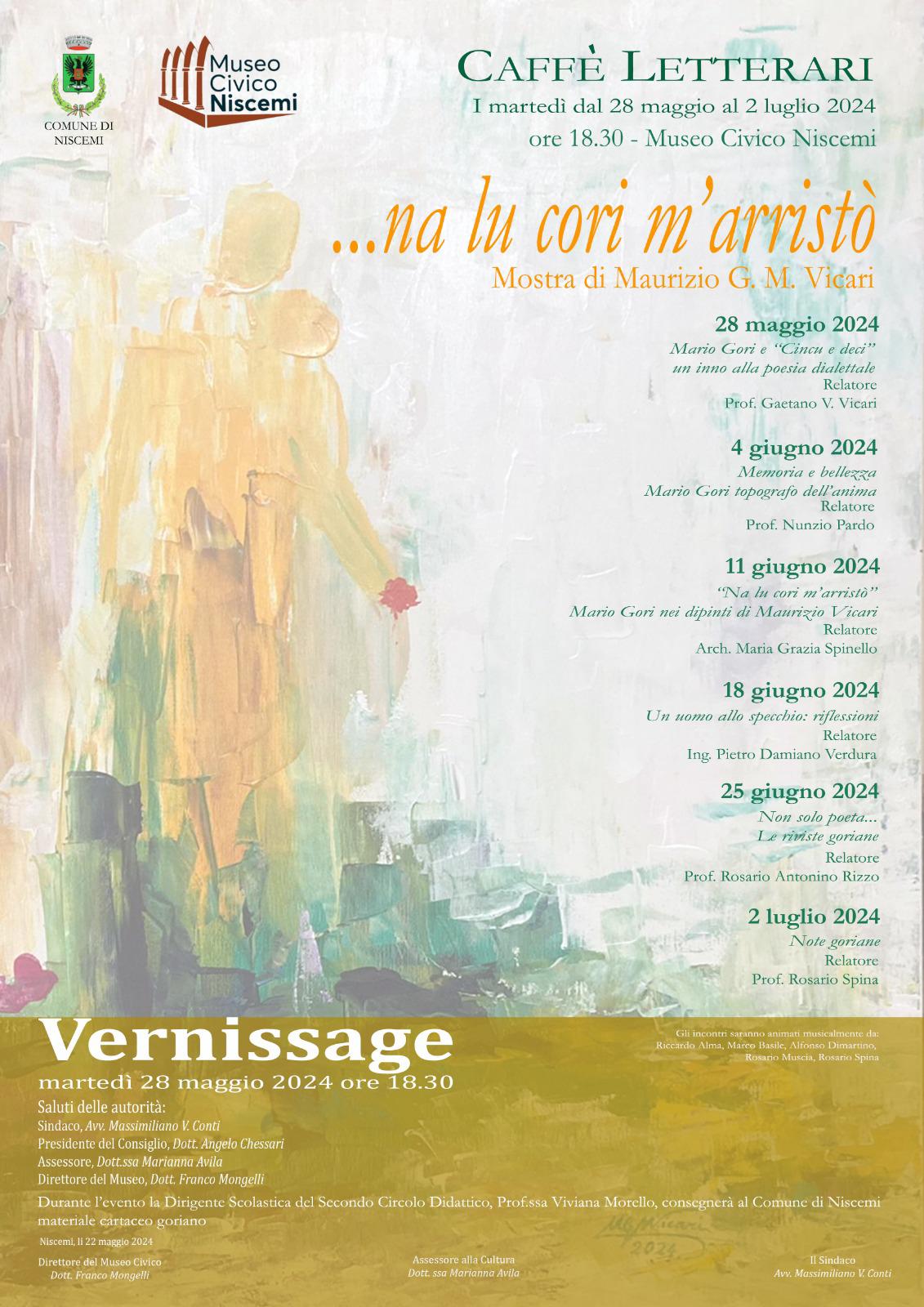 Niscemi - ‘Nà lu cori m’arristo’, è il titolo della mostra a cura del prof. Maurizio Vicari che fa da sfondo ad una rassegna letteraria. Nel cuore di Vicari è rimasto Mario Gori, come in quello di tutti i niscemesi. Perchè Mario Gori è il poeta contemporaneo eternato sin da subito dopo la morte preoce, da Giuseppe Blanco. A Gori è dedicata la rassegna culturale. Domani iniziano i Caffè letterari al Museo Civico di Niscemi con il patrocinio del Comune di Niscemi.