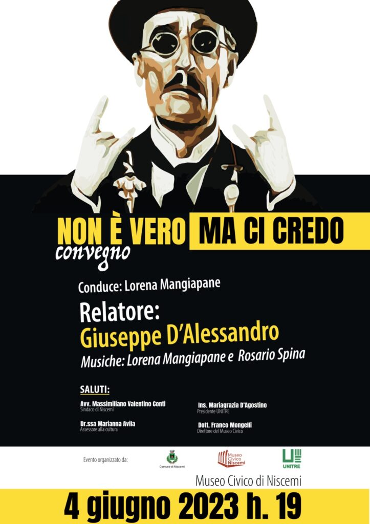Sono 13 milioni gli italiani che si recano per un “consulto” dai maghi, che sono ben 155.000, con un giro d’affari annuo stratosferico (circa 8 miliardi di euro). E così l’Unitre di Niscemi, presieduta dall’ins. Mariagrazia D’Agostino, ha pensato bene di organizzare un incontro dal titolo emblematico, Non è vero ma ci credo, nella cui locandina troneggia un indimenticabile Totò vestito da jettatore.