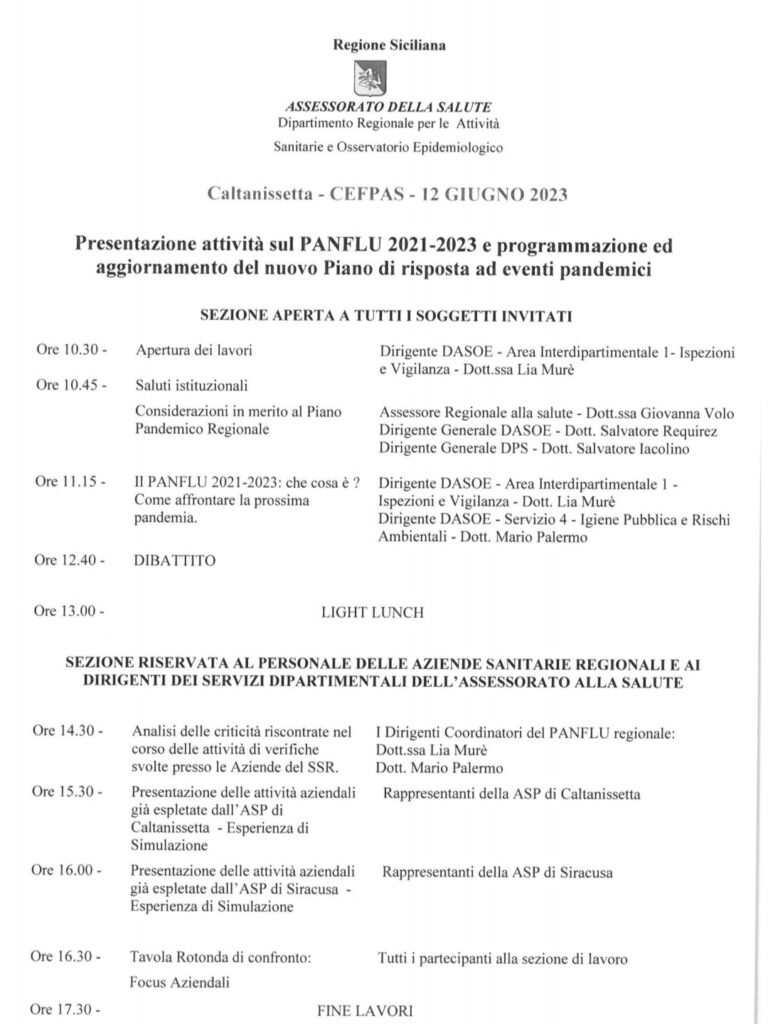 Caltanissetta – Lunedì 12 giugno presso il Cefpas di Caltanissetta avrà luogo, dalle ore 10 alle 17.30, la presentazione delle attività ad oggi svolte in merito al PanFlu 2021-2023 e la programmazione del nuovo Piano di risposta ad eventi pandemici.