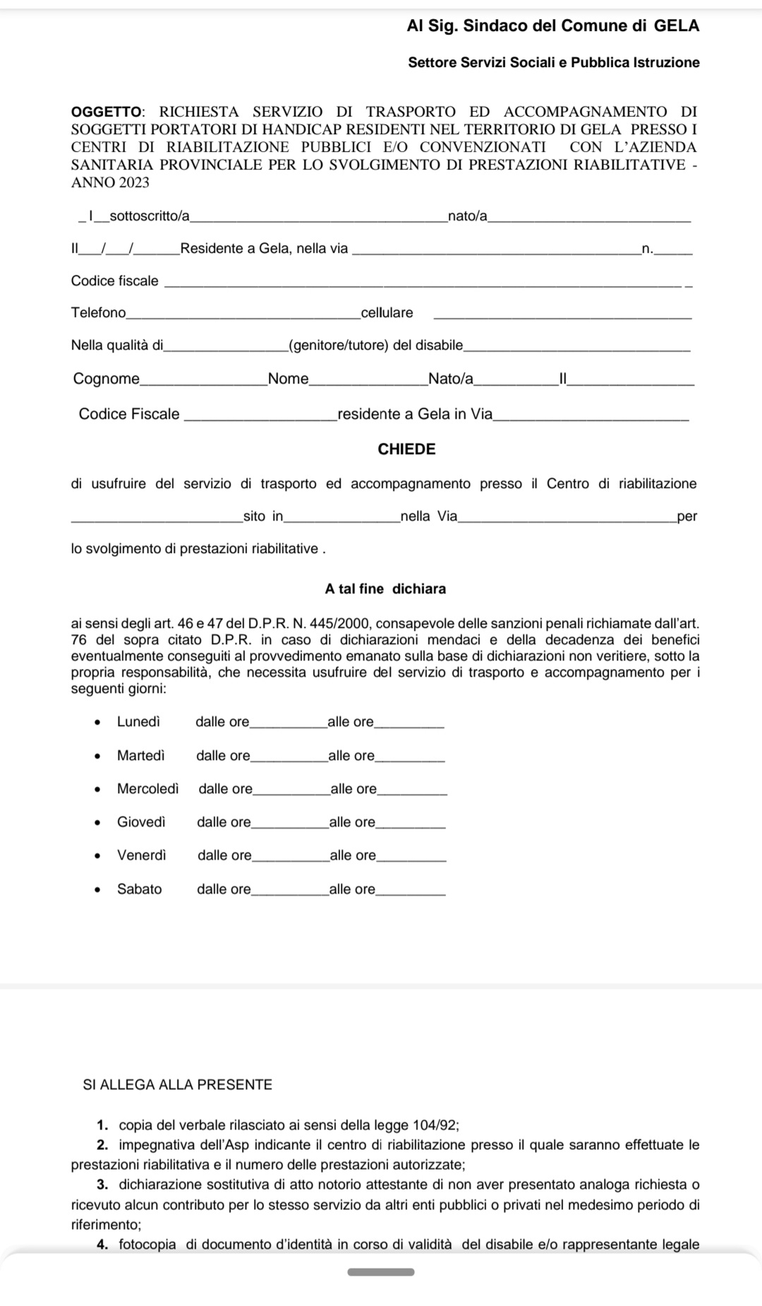Le istanze dovranno essere compilate sul modello predisposto che potrà essere scaricato dal sito www.comune.gela.cl.it – home page – Avvisi.