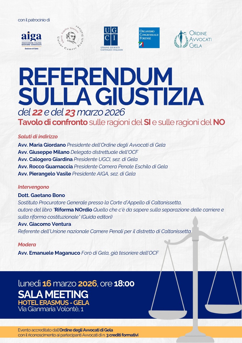 Previsti, tra gli altri, gli interventi di Gaetano Bono, sostituto procuratore generale presso la Corte d'appello di Caltanissetta e dell'avvocato Giacomo Ventura, referente nazionale Camere Penali del distretto di Caltanissetta. Modererà i lavori, l'avvocato Emanuele Maganuco.