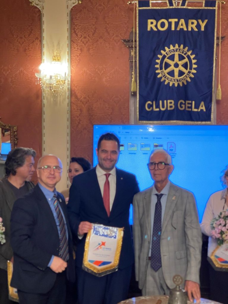 Al termine dell’incontro il presidente Granvillano ha avuto il piacere di donare i gagliardetti con il simbolo dell’anno sociale in corso a ciascuno dei relatori presenti ed infine così come da statuto e consuetudine storica del Rotary club Gela, ha insignito il sindaco Terenziano Di Stefano, quale socio onorario del Rotary club Gela direttamente dall’autorità rotariana presente, il dott. Luigi Loggia , assistente del Governatore del Rotary Sicilia Malta Giuseppe Pitari, procedendone a seguire l’iscrizione nella piattaforma My Rotary, piattaforma che permette di conoscere e riconoscere il Rotary nel mondo a livello internazionale.