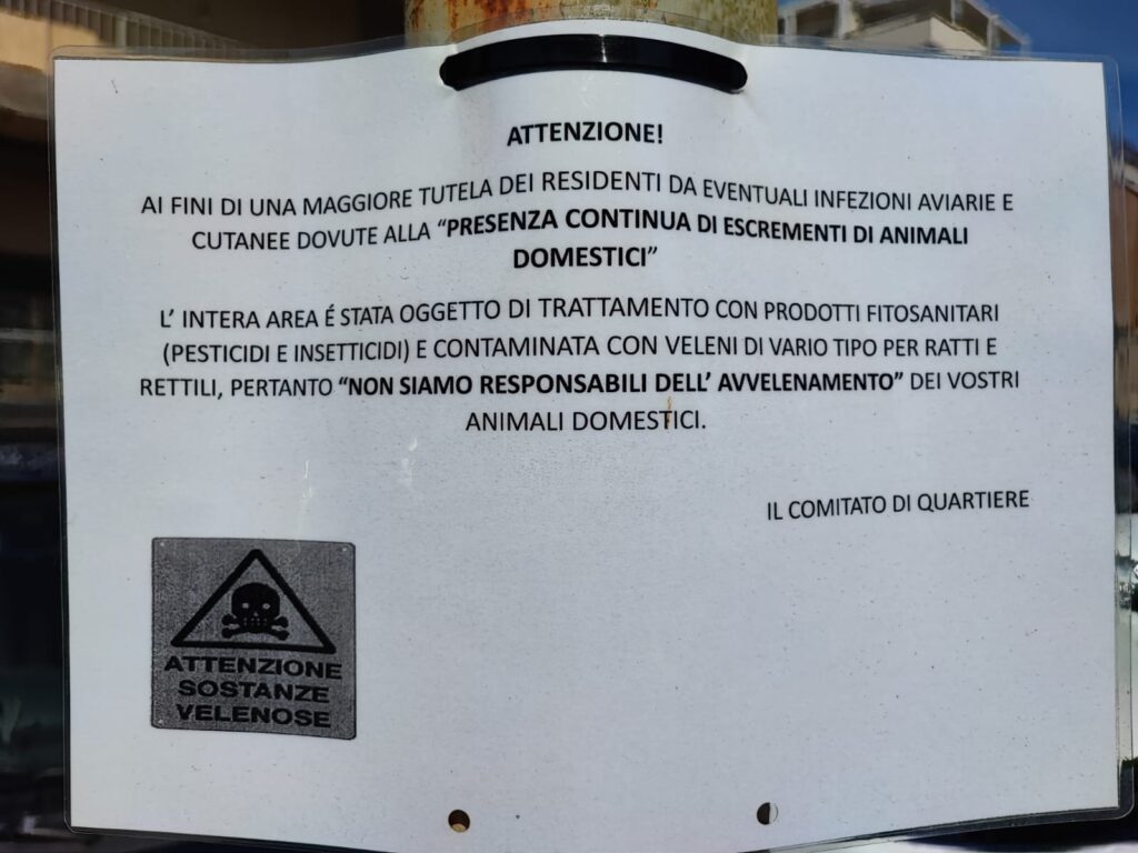 "Questo comitato di quartiere caposoprano-piano notaro comunica ufficialmente di non essere il responsabile della posa del cartello di avviso di presenza di veleni nella via Parioli e si riserva di tutelare il nome di questo comitato nelle opportune sedi" precisa il presidente Ugo Lo Piano.Il mistero si infittisce. Le associazioni animaliste si sono date appuntamento alle 15 di oggi. Erano presenti Liliana Mistretta per l' Oipa , Giulia Cassaro di Vita randagia e Gianna Castagna lida gela