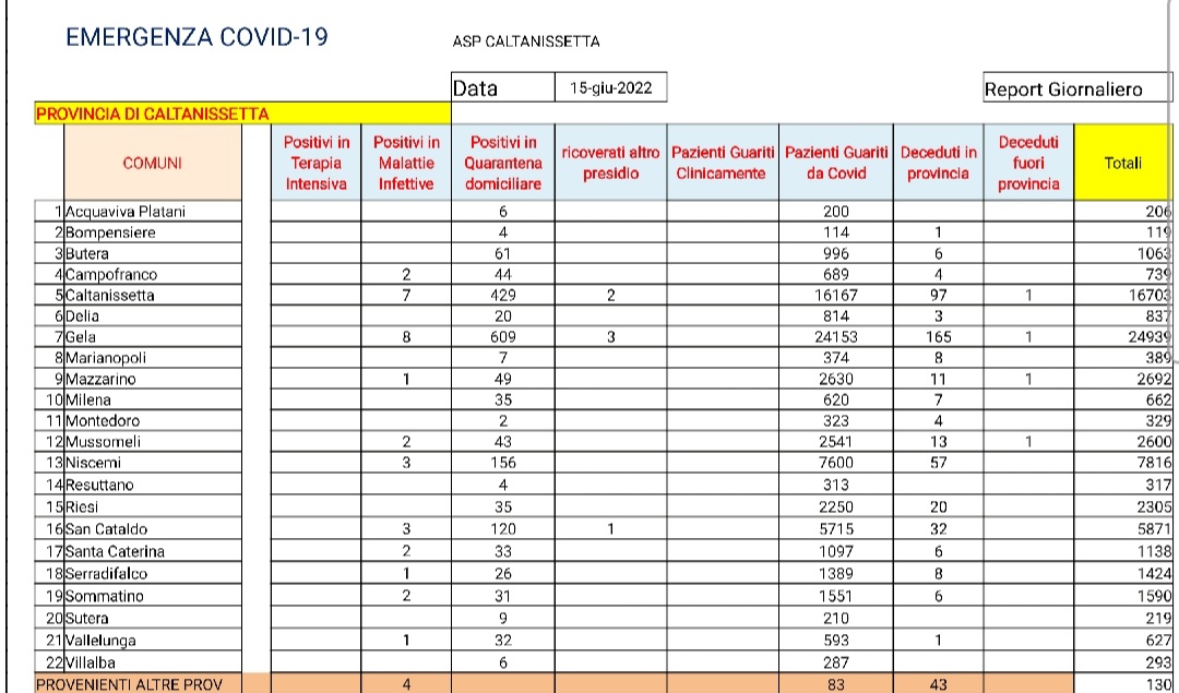 Caltanissetta- Salgono a 620 i positivi di Gela. Nelle ultime 24 ore riscontro di 124 pazienti positivi al SARS CoV-2, tutti in isolamento domiciliare: 45 pazienti di Gela, 35 di Caltanissetta, 13 di Niscemi, 11 di San Cataldo, 4 di Sommatino, 2 di Mazzarino, 2 di Milena, 2 di Mussomeli, 2 di Serradifalco, 2 di Santa Caterina Villarmosa, 1 di Butera, 1 di Campofranco, 1 di Marianopoli, 1 di Resuttano, 1 di Riesi e 1 di Villalba. Ricoverati in degenza ordinaria: 2 pazienti di Gela, 2 di San Cataldo e 1 di Campofranco. Trasferito presso altra provincia 1 paziente di Gela. Dimessi dalla degenza ordinaria 2 pazienti di Caltanissetta. Guariti da Covid-19: 32 pazienti di Gela, 24 di Caltanissetta, 9 di San Cataldo, 5 di Niscemi, 4 di Milena, 3 di Butera, 1 di Bompensiere, 1 di Delia, 1 di Montedoro, 1 di Mussomeli, 1 di Riesi, 1 di Serradifalco e 1 di Sommatino.