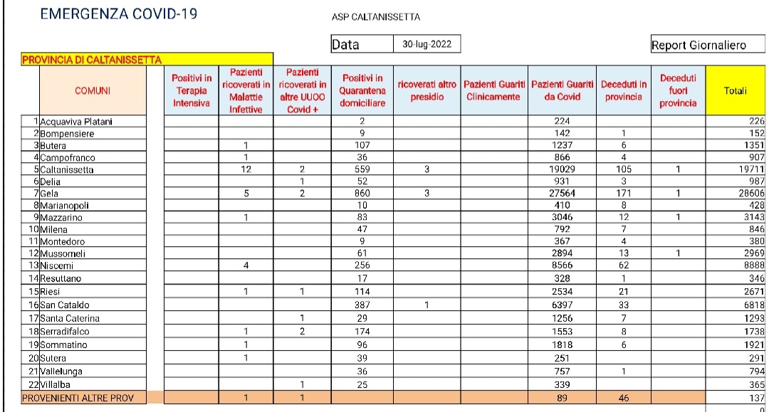 Caltanissetta- Da 1470 ad 870 in poche settimane. I contagi a Gela sono quasi dimezzati. Nelle ultime 24 ore riscontro di 95 pazienti positivi al SARS CoV-2, tutti in isolamento domiciliare: 36 pazienti di Gela, 22 di Caltanissetta, 7 di Niscemi, 7 di San Cataldo, 4 di Mazzarino, 4 di Riesi, 4 di Sommatino, 2 di Milena, 2 di Mussomeli, 2 di Serradifalco, 1 di Butera, 1 di Campofranco, 1 di Marianopoli, 1 di Sutera e 1 di Vallelunga Pratameno. Ricoverati in degenza ordinaria: 1 paziente di Mazzarino. Dimessi dalla degenza ordinaria: 1 paziente di Caltanissetta e 1 di Butera. Guariti da Covid-19: 57 pazienti di Gela, 47 di Caltanissetta, 20 di Niscemi, 11 di Riesi, 8 di Mazzarino, 4 di San Cataldo, 3 di Milena, 2 di Mussomeli, 2 di Santa Caterina Villarmosa, 2 di Sommatino, 1 di Campofranco, 1 di Montedoro, 1 di Serradifalco, 1 di Vallelunga Pratameno e 1 di Villalba.