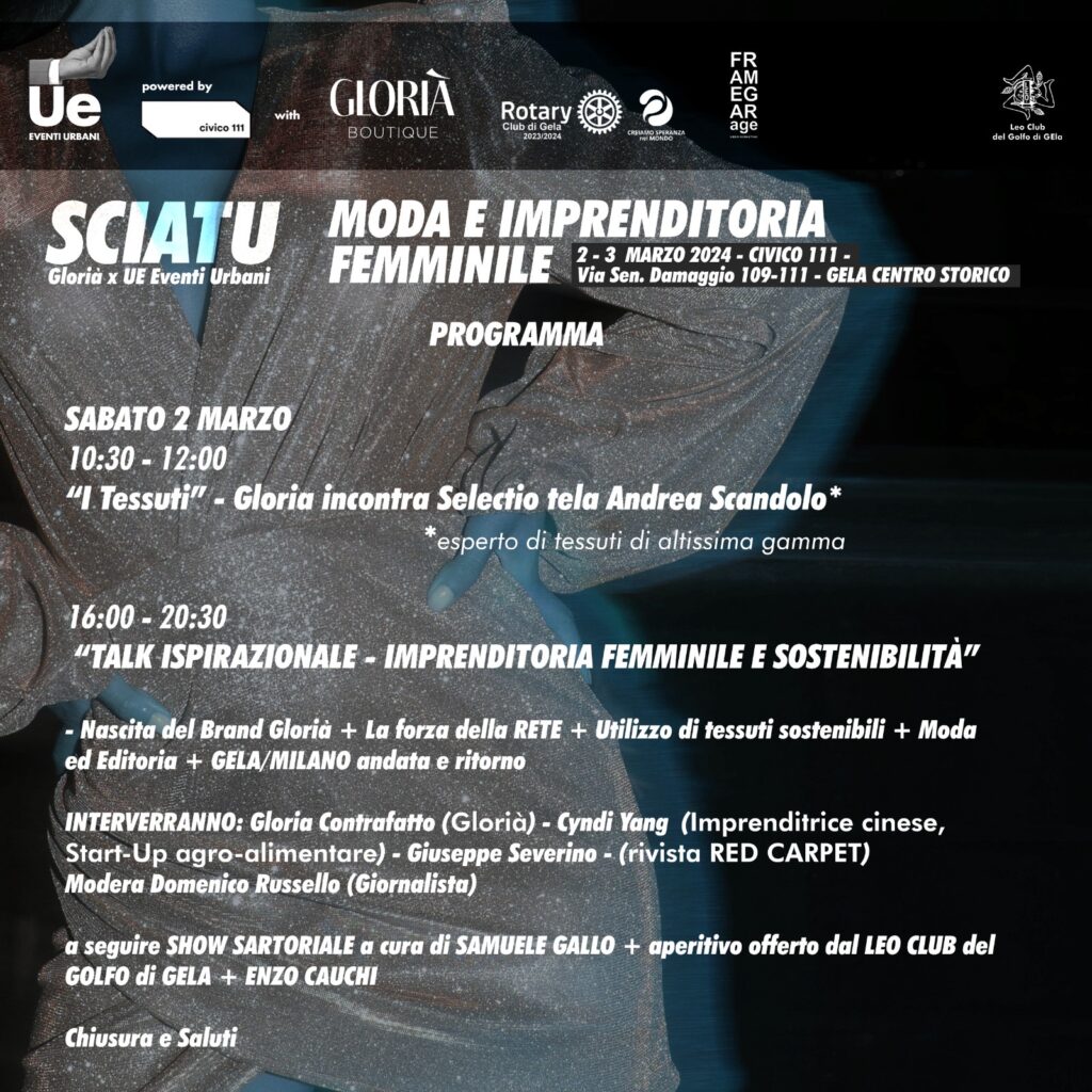 Nel pomeriggio di oggi dalle 16.30, in particolare, si terrà un talk su “Moda e imprenditoria femminile”. Partner dell’evento in questo caso è il Leo club del golfo di Gela. L’iniziativa proseguirà domenica pomeriggio con altri appuntamenti al Civico 111, come da programma, per un fine settimana ricco di arte, moda e creatività.