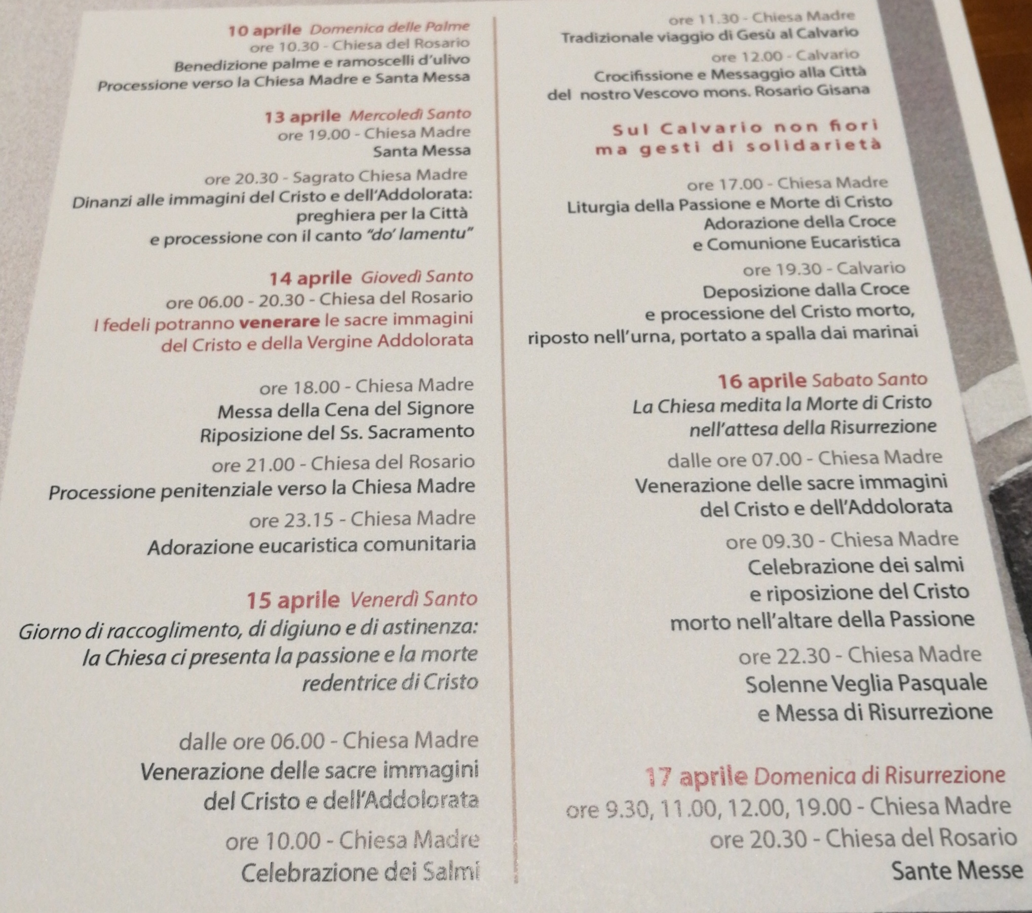 Con la domenica delle Palme comincia la Settimana santa. La parrocchia della Chiesa Madre che custodisce le sacre effigi del Cristo e della Madonna Addolorata e che gestisce queste celebrazioni ha reso noto il calendario degli appuntamenti liturgici.