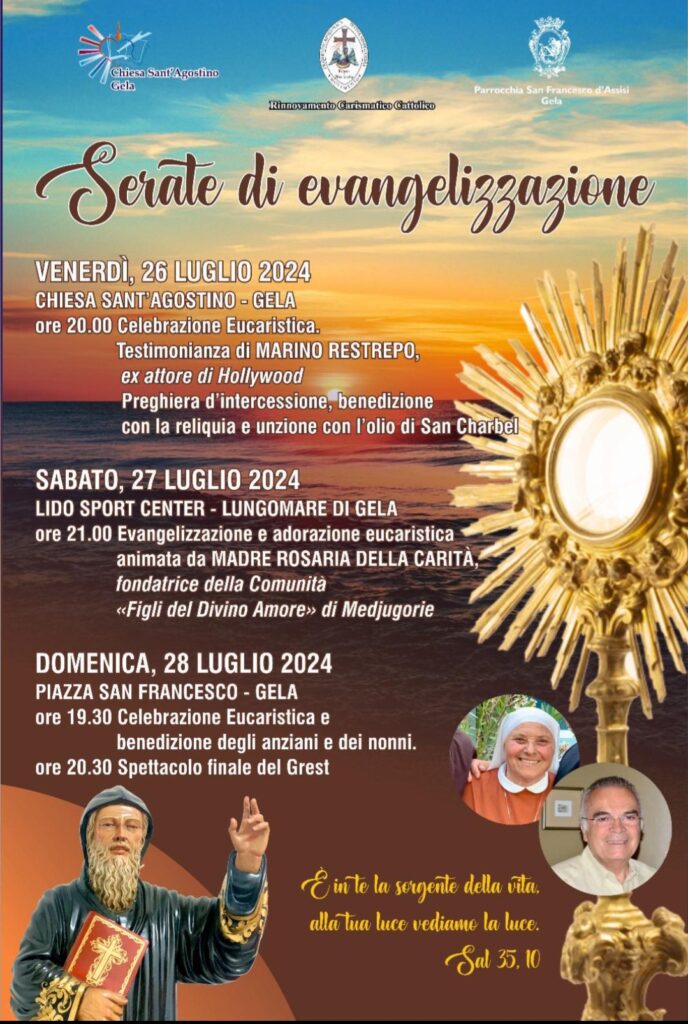 Quest’anno saranno tre i momenti che caratterizzeranno le serate di evangelizzazione: stasera 26 luglio alle ore 20.00, presso la Chiesa di Sant’Agostino, si celebrerà la santa Messa in onore di San Charbel e a seguire la testimonianza di conversione del dott. Marino Restrepo noto attore di Hollywood; domani 27 luglio alle ore 21,00, presso il Lido Sport Center del Lungomare, si terranno l’evangelizzazione e l’adorazione eucaristica condotte da don Lino di Dio e la testimonianza di Madre Rosaria della Carità, fondatrice della Comunità Figli del Divino Amore di Medjugorje.