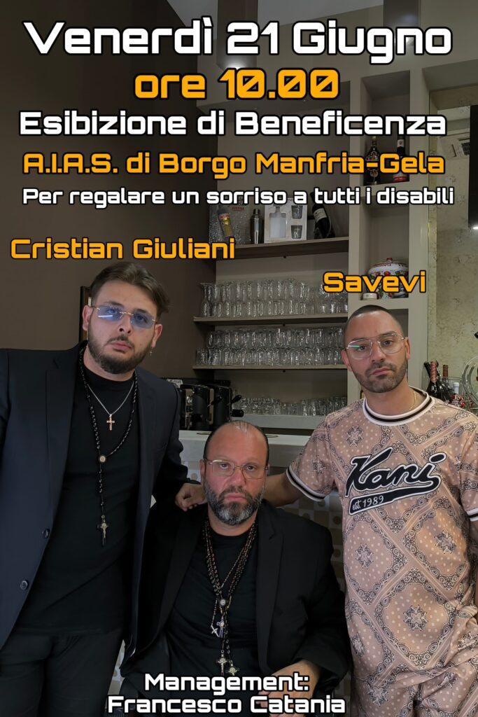 Un cantante neomelodico gelese Cristian Giuliani con Saveri, un trapper napoletano di Catania, regaleranno con le loro esibizioni musicali un momento di spensieratezza e di gioia agli assistiti dell'Aias di Borgo Manfria.
