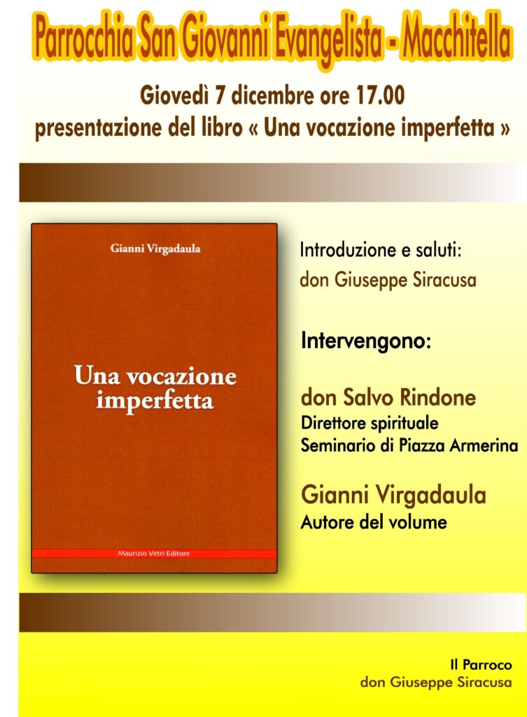 La presentazione del libro si terrà il 7 dicembre alle ore 17.00 alla parrocchia dedicata a San Giovanni Evangelista di Gela. I lavori saranno introdotti da don Giuseppe Siracusa e don Salvo Rindone, direttore spirituale del Seminario di Piazza Armerina alla presenza dell' autore.
