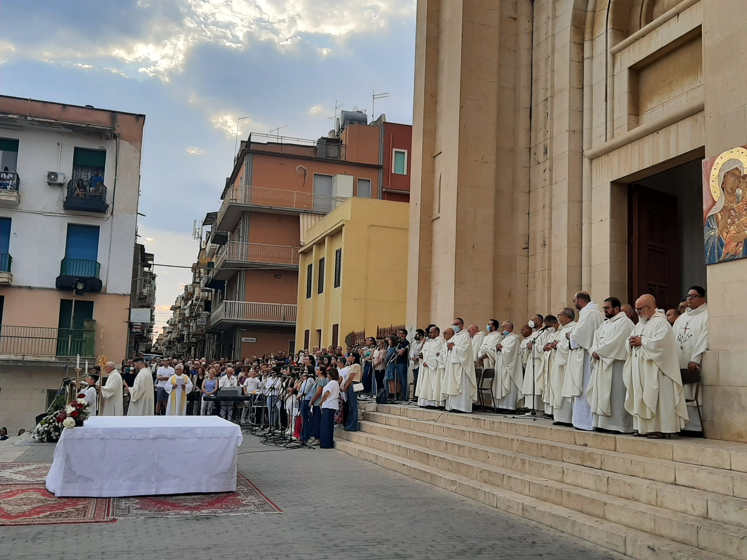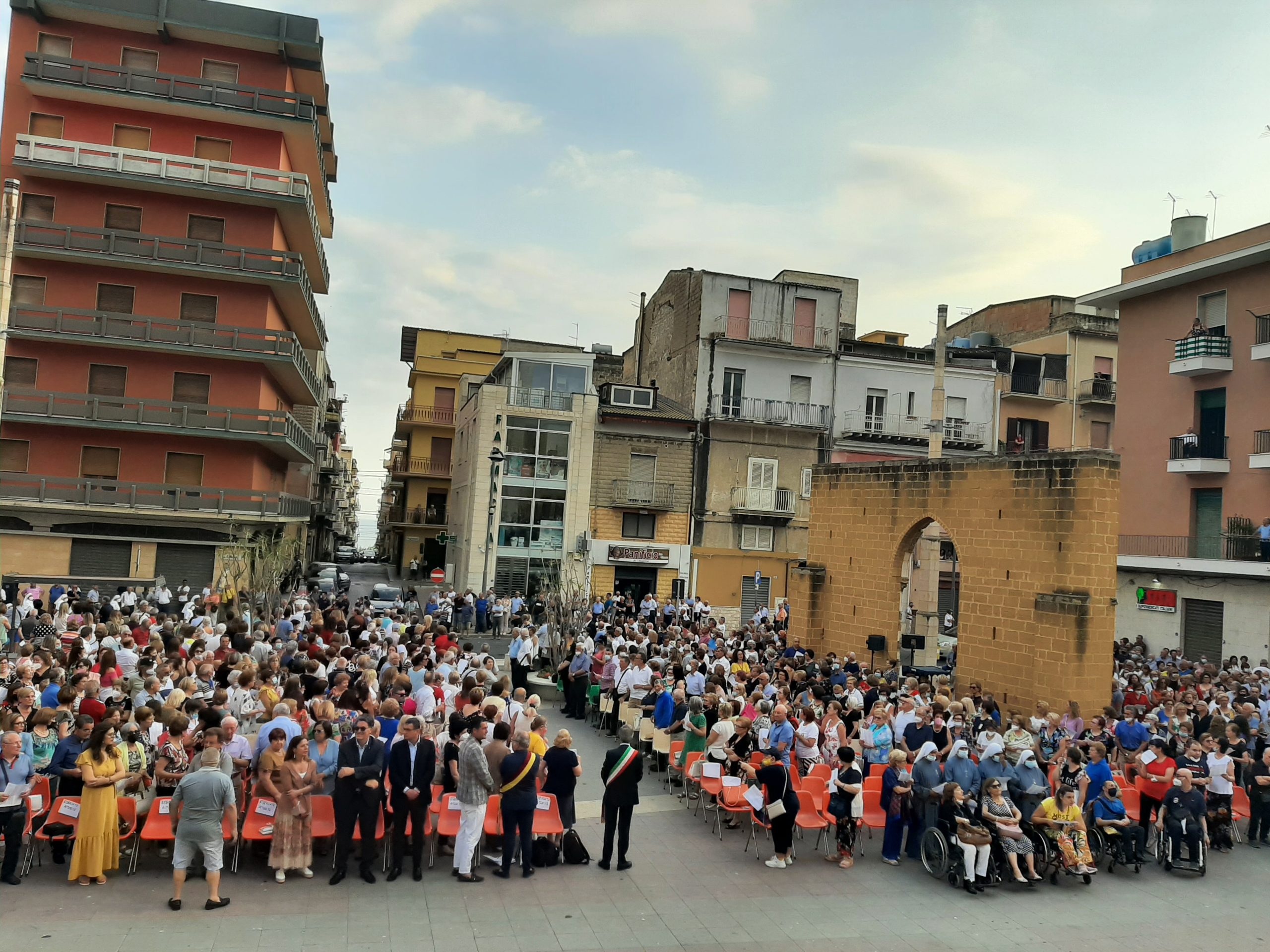 Piazza gremita come sempre ma dopo due anni di fermo emozione speciale. La solennità del Corpus domini quest'anno ha assunto una connotazione speciale: quella del ritorno alla vita ed alle celebrazioni solenni attese dal popolo di Dio come atto d'amore particolare in un frangente storico che vede l'uomo sottoposto a grandi prove. Il clero al completo come anche l'amministrazione comunale. Silenzio assoluto e canti celestiali del coro della parrocchia Regina Pacis. L' Unitalsi fa la sua parte con la sfilata delle persone in difficoltà, ospiti di riguardo in questa occasione. La celebrazione eucaristica procede spedita. Dopo la declamazione del Vangelo prende la parola il Vicario Foraneo don Lino Di Dio che pronuncia il monito finalizzato a riprendere le fila di una città che soffre: